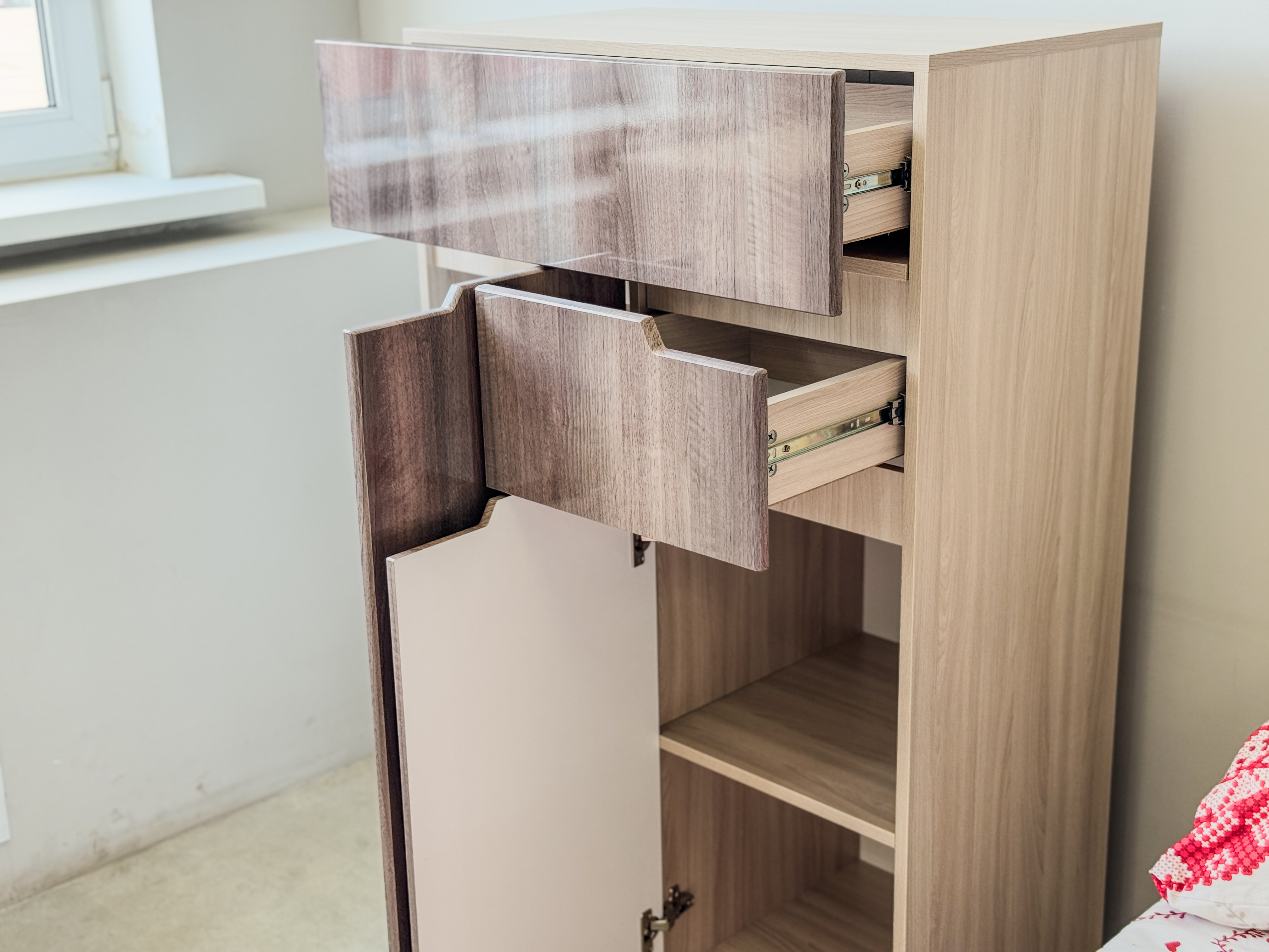 Глянцевый комод удобен в уходе, достаточно протереть его мягкой тканью и не использовать средства для уборки.Оснащен выкатными ящиками и полочками за створками