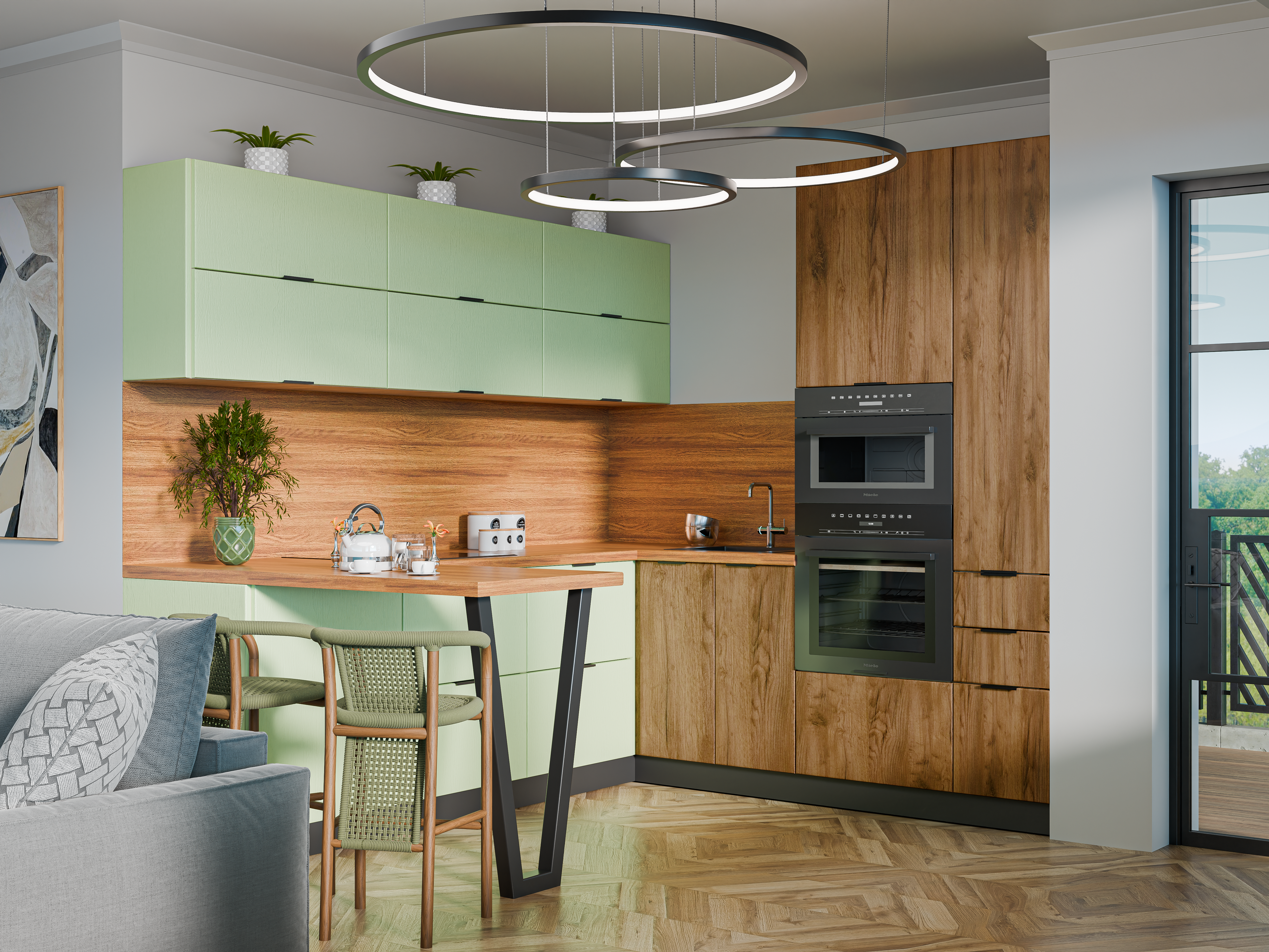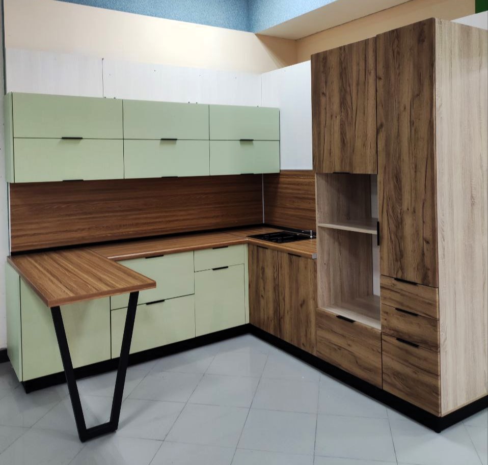 - Цветовая гамма: нежные оливковые оттенки верхних шкафов гармонично сочетаются с тёплыми древесными тонами нижних модулей и фартука. Такое сочетание придаёт интерьеру свежесть и естественность.